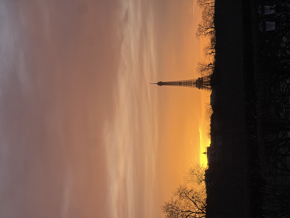 - "The Eiffel Tower silhouette is centered against an orange and golden sunrise or sunset" by FM-t80Kg1, licensed under CC BY 4.0