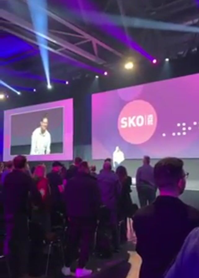 crowded conference hall with people standing and applauding. A speaker stands on a stage lit with bright purple and blue lights. Two large screens display images: one shows the speaker alone and later with a group of people, while the other displays the "SKO" logo. The audience is mostly comprised of individuals dressed in dark clothing. The hall has exposed metal beams across the ceiling. The camera remains relatively still, capturing the scene from within the audience.