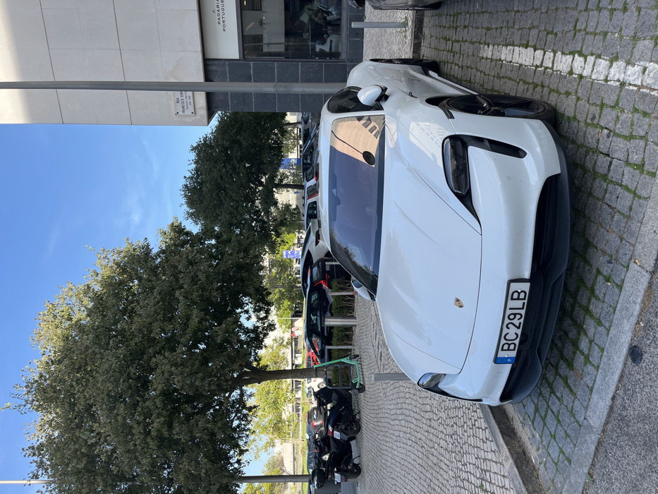 - "A white Porsche Taycan electric sports car, bearing Portuguese license plate P BC 29 LB, is parked in a designated space on a cobblestone surface" by FM-XmQCg2, licensed under CC BY 4.0
