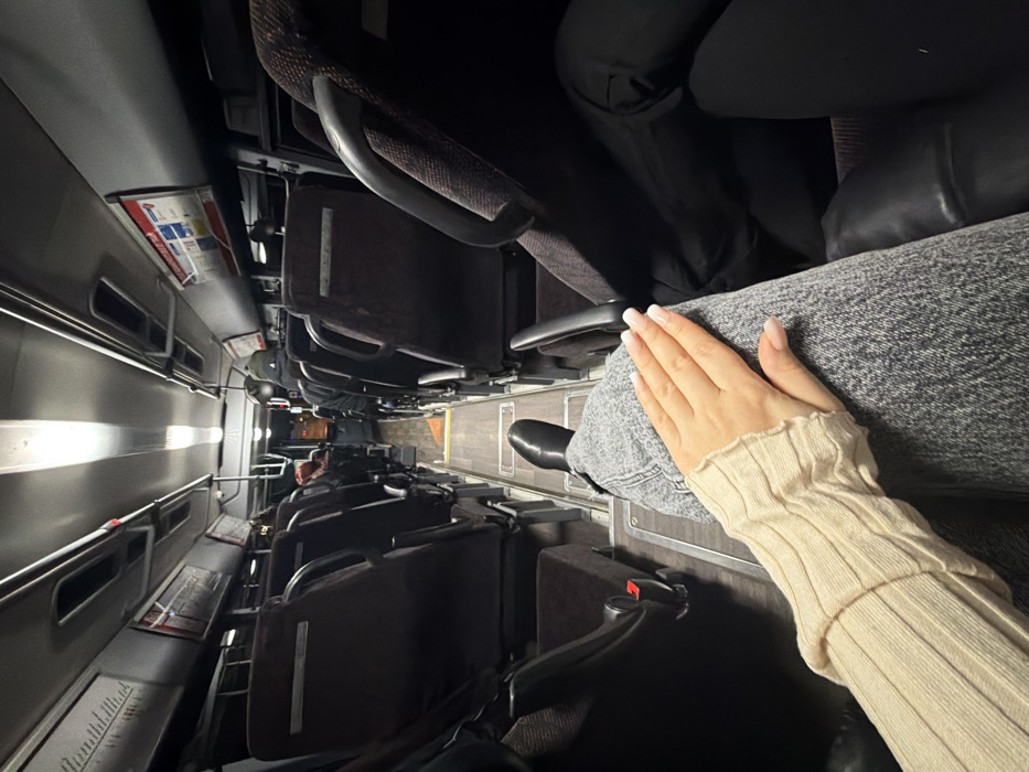 An interior view of a passenger train car. Rows of upholstered seats line either side of a narrow aisle, with a passenger seated in the foreground. The passenger wears a light beige ribbed sweater and gray jeans, their hand gently placed on their leg. Luggage and other passengers are visible further down the aisle. Overhead lighting illuminates the interior, emphasizing the confined space.