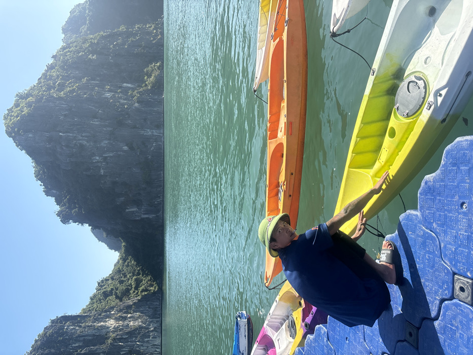 A man in a blue shirt and green hat stands on a blue floating dock, surrounded by colorful kayaks in the water. He gestures towards a yellow kayak. Behind him, the water stretches to the horizon, where a large, rocky mountain rises, its peak shrouded in mist. The sky is clear and blue.
