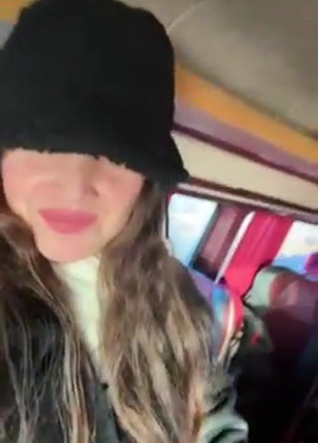 young woman with long brown hair, wearing a black bucket hat, a white scarf, and a black jacket, smiling and looking at the camera. She's seated in a bus, seemingly traveling with others. Red curtains are visible on the windows and other passengers are seen in the background, some wearing winter hats. The interior of the bus is somewhat worn. The woman seems to be recording a video blog or personal video. Loud music is playing in the background.
