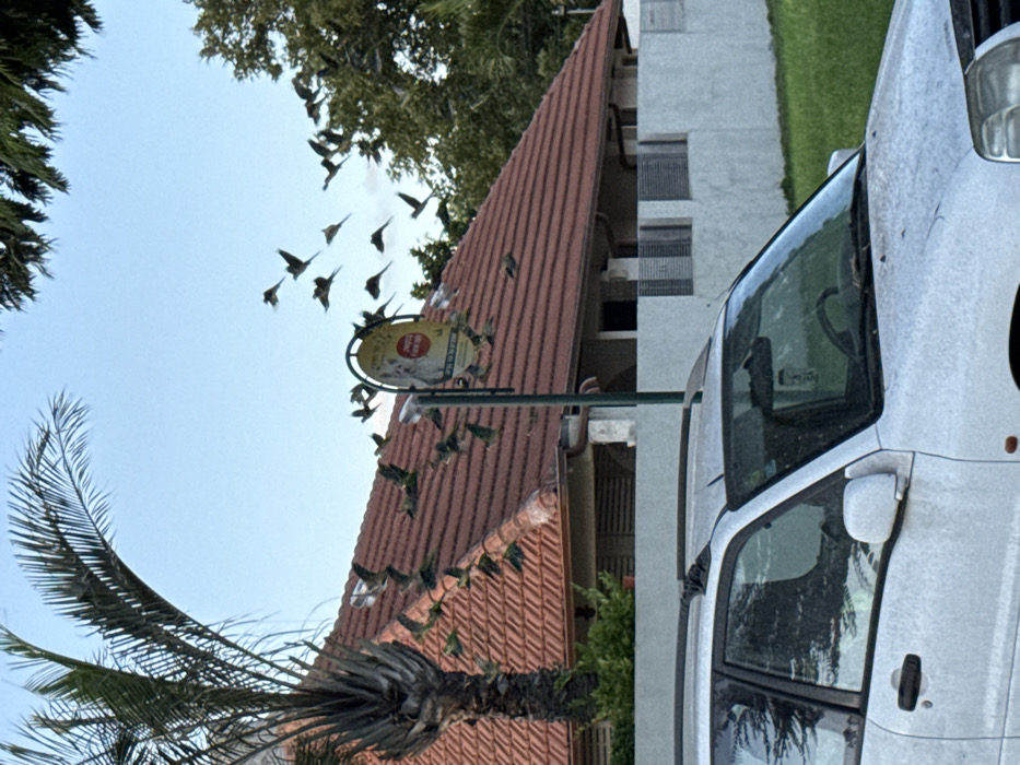The image captures an outdoor scene in Hod HaSharon, Israel, under a clear blue sky. In the foreground, the front and driver's side of a white SUV with roof racks are partially visible, appearing speckled with dirt or dust. A green street pole, topped with a circular yellow sign displaying Hebrew text and images, extends vertically behind the vehicle. In the midground, a residential building with a prominent red-tiled roof and light-colored walls is visible, set back behind a low white concrete fence featuring horizontal grates. A large palm tree with visible fronds and trunk stands to the left of the building. Numerous green parakeets are in various stages of flight, forming a dispersed flock around the street sign and above the house's roofline. The background features dense green foliage from trees on the right, contrasting with the otherwise clear sky.