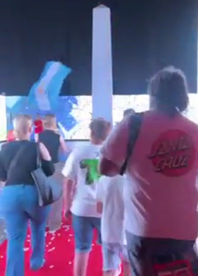 group of people walking on a red carpet towards a stage with a white obelisk. A person in the middle is waving an Argentinian flag. Confetti is scattered on the red carpet. One person is taking a photo with their phone. Several people are wearing white shirts. One shirt has "Santa Cruz" printed on it.