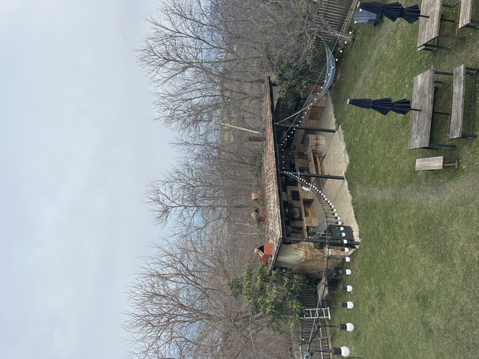 This image depicts an outdoor garden area, likely belonging to a restaurant or guesthouse, situated in Sighnaghi, Georgia, with a panoramic view of the surrounding landscape. The scene is observed from an elevated perspective, looking down. In the mid-ground, a central, rustic, open-air structure features a tiled roof and brickwork, housing multiple integrated ovens or grills, suggesting an outdoor kitchen or barbecue area. A stone-paved patio extends from this structure. String lights with round, opaque bulbs are suspended across the structure's open frontage and along a path leading from it. To the left of the main structure, a single evergreen tree with green foliage is visible, alongside a metal ladder leaning against a fence. A blue and white striped fabric hammock is strung between two posts to the right of the structure. The foreground consists of a well-maintained green lawn. Several outdoor dining sets are arranged on the grass, comprising dark, rectangular wooden tables paired with matching benches. Two of these tables are equipped with collapsed black patio umbrellas. A dirt path winds across the lawn. The background is dominated by numerous deciduous trees, currently bare of leaves, indicating either a late autumn, winter, or early spring season. Beyond the trees, the terrain descends into a valley with distant hills, and the sky above is uniformly overcast and light grey. No people are visible in the scene.