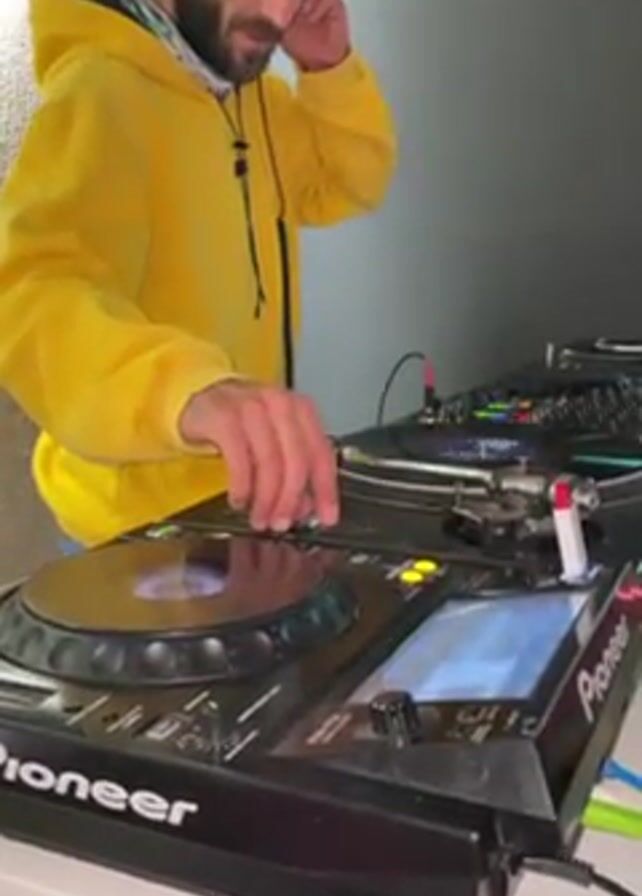 A bearded, white male DJ wearing a yellow hoodie and headphones operates a Pioneer DJ system. He stands in front of the equipment, manipulating the turntable with his right hand while listening through his headphones. The DJ console features a screen and various buttons and dials. There are additional turntables behind and next to the main console. A gray wall serves as the background.