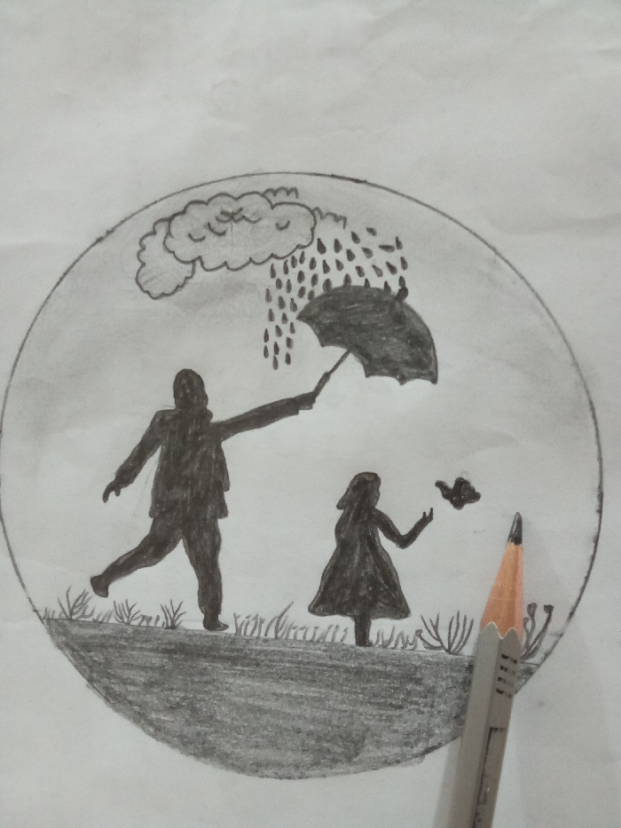 The image displays a monochrome pencil drawing executed on white, lightly creased paper. The central artwork is contained within a circular border, featuring two silhouetted human figures in an outdoor, rainy environment. A sharpened lead pencil with a pink eraser is partially visible in the bottom right foreground, resting on the paper and slightly overlapping the drawing's circular edge. Within the drawing, a larger, adult-like figure stands on the left, depicted in motion with a raised left leg. This figure extends their right arm upward and forward, holding an open, dark umbrella positioned over both figures. Rain is illustrated by vertical lines falling from a stylized cloud in the upper-left quadrant, impacting the umbrella. To the right of the adult figure, a smaller, child-like figure stands in a dress, with their right arm raised toward a small, dark, butterfly-like object hovering in the air. Both figures are situated on a dark, textured ground line with sparse, stylized vegetation. The background within the circle is uniformly light gray. This image is a drawing and does not depict a specific real-world location within the city of Quetta, Pakistan. The scene is an artistic representation rather than a photographic record of a geographical landscape.