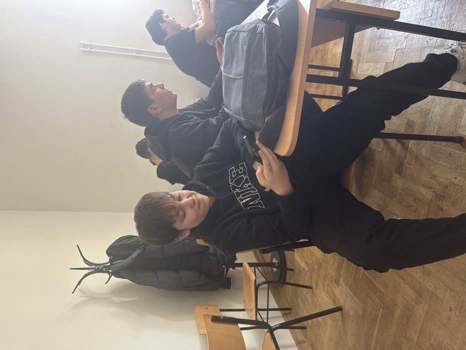 The image depicts an interior classroom scene within a building in Sofia, Bulgaria. In the foreground, a young male individual, appearing to be a student, is seated on a wooden chair with a metal frame, positioned at a light-colored wooden desk. He is wearing a black hooded sweatshirt with "NIKE" printed in white on the chest, and black sweatpants with white athletic shoes. He is holding a black smartphone horizontally with both hands, looking down at the screen with a slight smile. A grey fabric shoulder bag rests on the desk to his right. Behind him and to the right, several other male students are visible, also seated at similar desks. One student directly behind the foreground subject is wearing a black hoodie and facing towards the right side of the frame. Further back, other students are partially obscured. The room has light-colored, possibly cream, walls. In the upper left background, a black metal coat rack stands against the wall, holding a dark-colored, puffy winter jacket. The floor is covered with light-colored parquet flooring arranged in a herringbone pattern. White vertical piping is visible on the wall in the upper right quadrant, suggesting building utilities. Natural light enters the room from an unseen source to the right, creating a bright area in the upper right background.