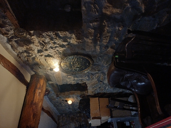 The scene is an interior view within a building in Dolna Oryahovitsa, Bulgaria. The room features walls constructed from irregular, dark-toned stones with visible mortar joints, and a white ceiling supported by two prominent, rough-hewn wooden beams. Illumination is provided by multiple bare incandescent bulbs: one hangs centrally on the left wall section, another is positioned higher on the right stone wall, and a third, fainter light source or object is visible within a dark rectangular recess on the right, resembling a large fireplace or alcove. Mounted on the central stone wall is a large, oval-shaped metallic plaque with intricate relief work, appearing dark bronze or brass in color and depicting a crest or coat of arms. A smaller, round metallic plaque is affixed higher on the right wall. In the immediate foreground, a dark brown, tufted leather armchair with wooden armrests is positioned. To its right, the backrest of a dark wooden chair is partially visible. Further back and to the left, another dark wooden chair is present, along with a stack of three cardboard boxes resting on a grey shelving unit. A dark plastic bag is situated atop the uppermost box. No individuals are present, and no active interactions or actions are depicted.