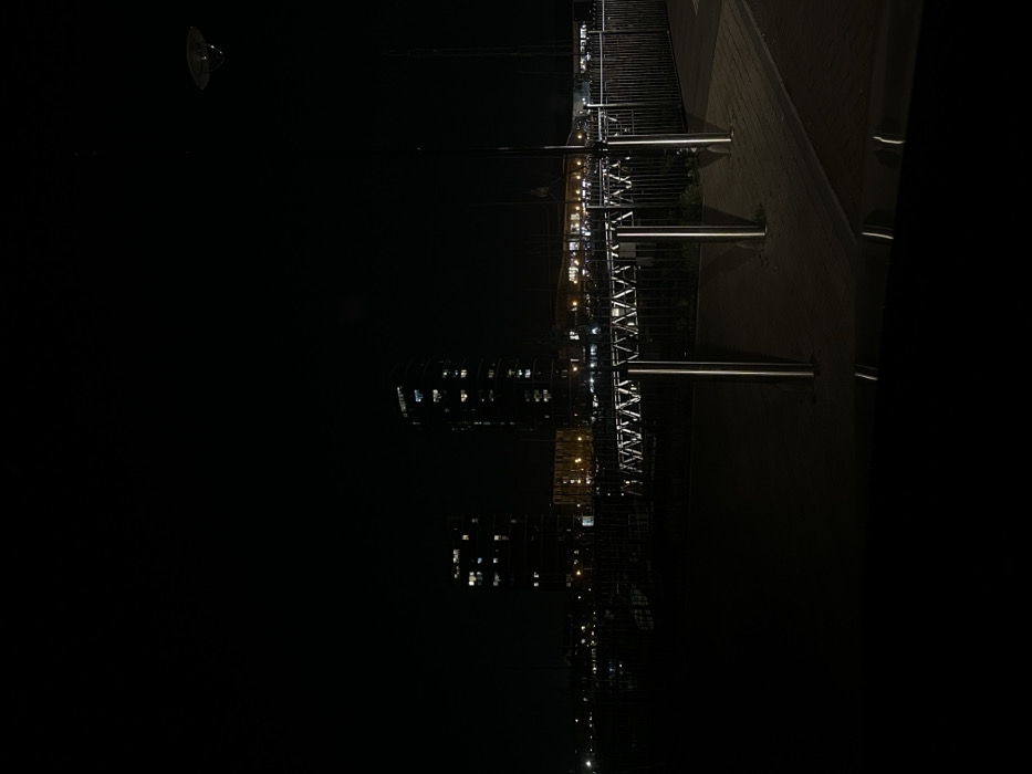 This image depicts a nighttime urban scene along the Medway Waterfront in Gillingham, United Kingdom. The upper portion of the frame is dominated by a dark, featureless sky. In the background, two dark, multi-story buildings, consistent with residential towers, stand silhouetted, displaying numerous illuminated windows. The taller of these towers is positioned slightly right of center, with a slightly shorter tower to its left. Below and extending between these structures, a horizontal pedestrian bridge-like element with visible triangular support trusses is brightly illuminated from underneath, suggesting it spans water or a dock. A dark metal fence, composed of vertical bars, stretches across the mid-ground, separating the background elements from the foreground. The immediate foreground consists of a dark, paved surface, likely a walkway, into which several reflective, cylindrical metal bollards or posts are embedded, casting reflections from ambient light. A street light fixture or surveillance camera is visible in the upper right corner. No individuals or specific actions are discernible within the scene.