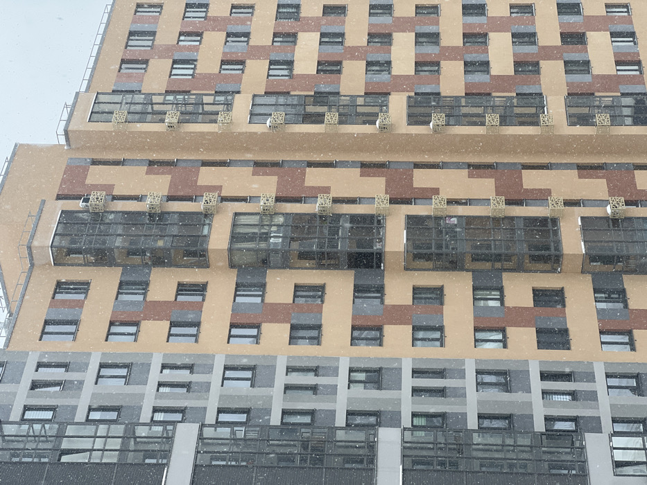 - "The scene depicts a close-up, upward-angled view of two modern, multi-story residential buildings in Izhevsk, Russia, during active snowfall under an overcast sky" by FM-4GQh52, licensed under CC BY 4.0