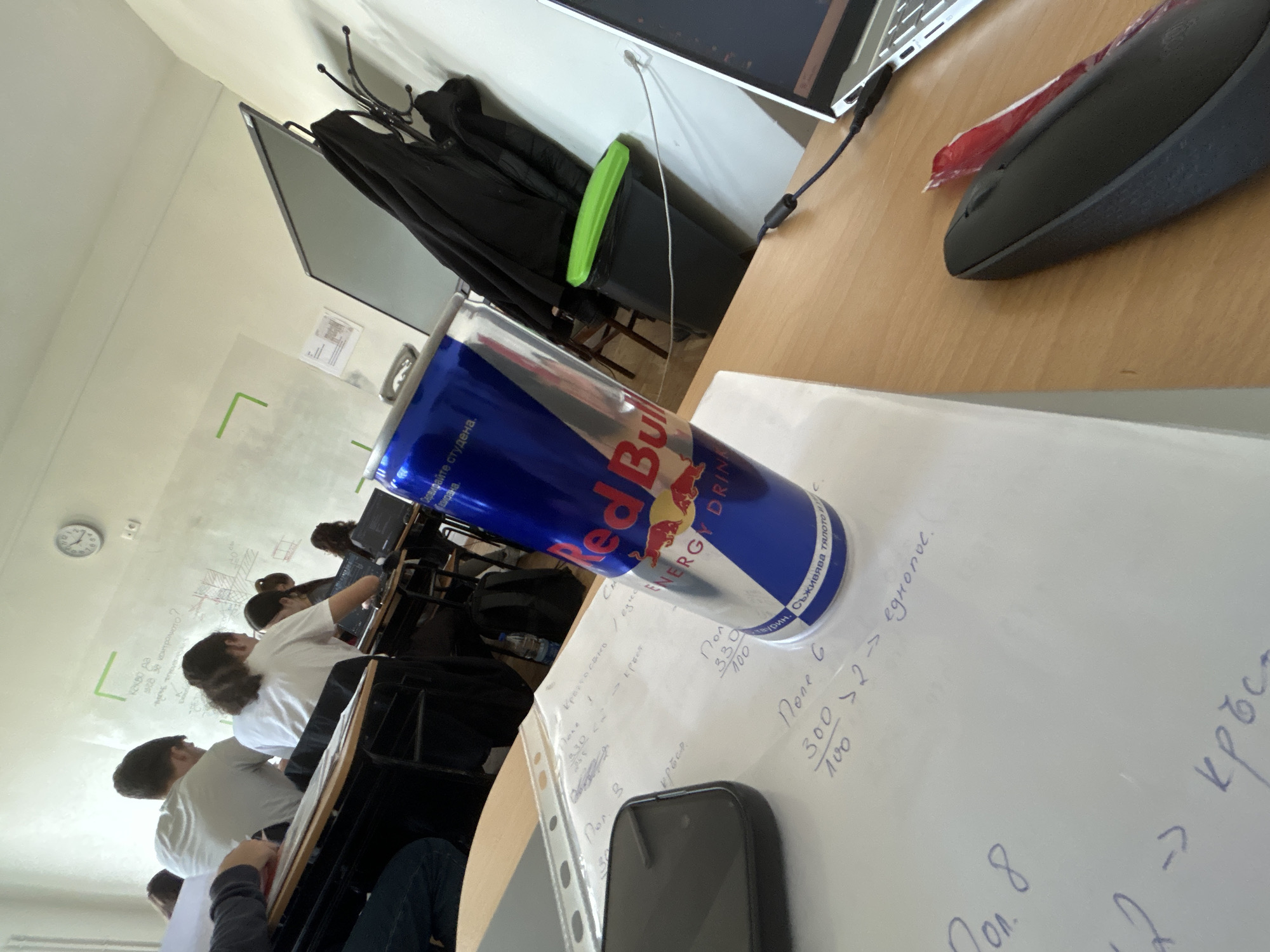 The image depicts an indoor classroom or lecture hall, observed from a student's desk perspective. The setting is identified as a school or university in Sofia, Bulgaria, based on the prevalent Bulgarian Cyrillic script found on objects within the scene. In the immediate foreground, on a light-colored wooden desk, a blue and silver Red Bull energy drink can is centrally positioned, displaying text including "Red Bull ENERGY DRINK" and Bulgarian phrases "Съживява тялото и духа" (Revitalizes body and spirit) and "Съхранявайте студена" (Keep cold). To the left of the can, a black smartphone rests face down. White papers under the can and phone contain handwritten notes in Bulgarian, including numerical expressions such as "300/100 > 2 -> еднополюс." (unipolar) and the word "кръст" (cross). To the right, a black computer mouse and a red wrapper are visible on the desk, adjacent to the partially visible silver lid and keyboard of a laptop connected by a black cable. In the midground, several students are seated at dark-framed desks with light-colored tops, facing away from the observer. They appear to be engaged in academic activity; some are using laptops. Notable figures include a student in a white t-shirt with dark hair tied back, and another in a white t-shirt. A black backpack and a plastic water bottle are visible beneath desks. The background consists of a large, light-colored wall serving as a whiteboard or projection screen, featuring faint handwritten Bulgarian text and diagrams, along with green tape outlining a rectangular area. A white wall clock displays approximately 1:15. To the right, a large, dark flat-screen monitor stands vertically near a white wall. A black coat rack with several dark jackets hangs beside the monitor. A black waste bin with a distinctive neon green lid is positioned below the coat rack. The room is brightly lit, suggesting overhead lighting.