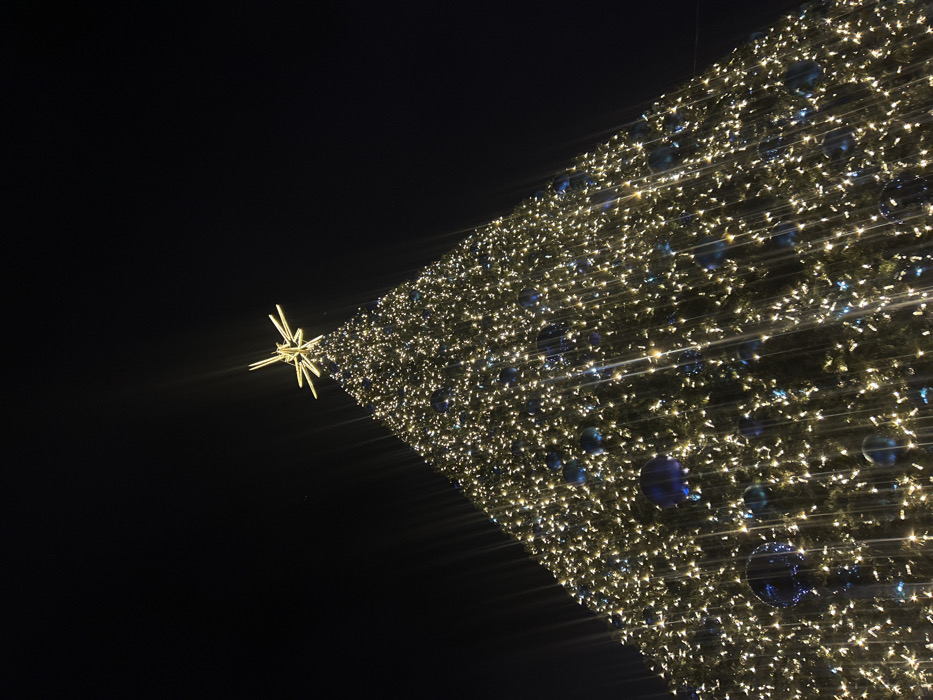 - "A Christmas tree is adorned with numerous white and blue lights and topped with a yellow star" by FM-2rkLO2, licensed under CC BY 4.0