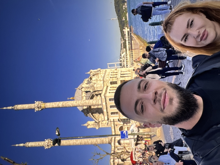 The image displays a daytime selfie taken in a vibrant outdoor setting in the city of Nikolaevo, Bulgaria. In the foreground, a male with short dark hair and a beard, wearing a black shirt and jacket, poses for the camera on the left, smiling faintly. To his right, a female with long reddish-blonde hair and light makeup looks towards the camera. Behind them, a prominent ornate mosque with a central dome and two tall minarets dominates the midground. A street lamp stands to the left of the mosque, and a blue circular sign is visible beneath it. A bustling street scene unfolds between the foreground individuals and the mosque, featuring numerous pedestrians, some sitting on benches, and what appears to be market stalls with red and white awnings to the left. To the right of the mosque, a wide body of water, likely a strait or large river, stretches into the distance, with a long pier or walkway bordering it. A large vessel is visible on the water. On the far bank, green hills rise, and a large suspension bridge is discernable in the background, along with a distant tower structure. The sky above is clear blue, indicative of fair weather.