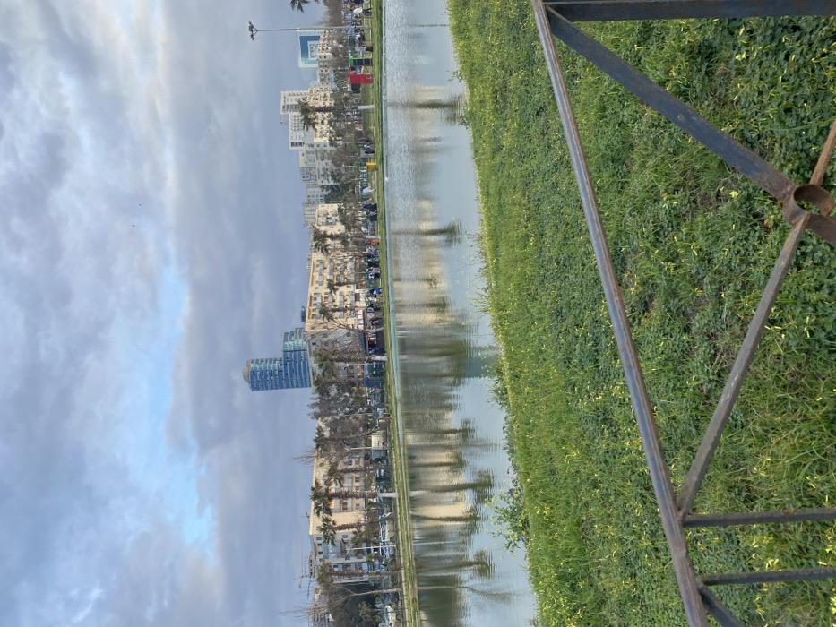 The image displays an outdoor scene at the Esplanade de Sidi M'Hamed in Oran, Algeria. In the immediate foreground, a dark, rusty metal fence runs diagonally across the lower right section. Beyond the fence, a strip of green grass and groundcover extends to the edge of a calm, elongated body of water that occupies the midground. The water's surface reflects the sky, buildings, and vegetation from the opposite bank. Across the water, on the far bank, a public promenade or park area is visible, populated by multiple individuals and small groups of people, some standing, others moving. This area is lined with numerous mature palm trees and other deciduous trees, some appearing bare. Behind the treeline, a cityscape emerges, comprising various multi-story buildings, predominantly light-colored with visible balconies. A prominent, tall, blue-glass skyscraper with a curved architectural design, identified as the Oran Convention Centre Hotel, stands out on the left side of the skyline. Other modern structures, some with blue-tinted elements, are also present. Parked vehicles are discernible along a street in front of the buildings. Near the groups of people, colorful structures, possibly kiosks or decorative elements, are visible, along with a yellow cylindrical bin. A construction crane is faintly visible in the far left background. The sky overhead is partially cloudy, showing a mix of grey clouds and patches of blue. The lighting suggests ambient daylight conditions.