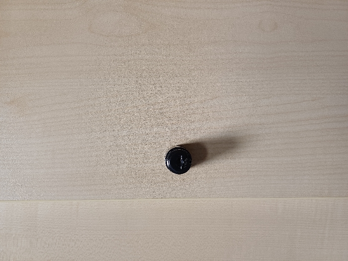 The image displays a light-colored wooden panel, likely a door or cabinet surface, situated in Grevenmacher, Luxembourg. A distinct vertical seam is present approximately one-quarter of the way from the left edge, separating two sections of wood. Mounted on the larger right section, slightly left of the image's vertical center and roughly one-third down from the top, is a single black, cylindrical knob. The knob has a textured surface and casts a clear, dark shadow downwards and to the right. The wooden surface exhibits a fine, vertical grain pattern and a slightly textured, uniform finish. No individuals, actions, or complex interactions are visible within the frame.