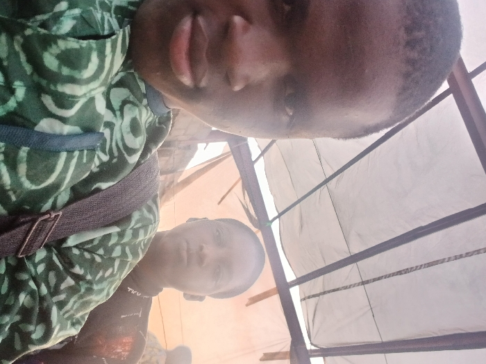 Two young men appear in a tilted selfie under a canopy-like structure. The man in the foreground wears a green patterned shirt and a strap. His face is large and dominant in the frame. The second man is positioned slightly behind, with a serious expression. The backdrop consists of a white fabric held up by a framework of beams and netting, partially obscuring the view beyond. The lighting suggests an outdoor setting, possibly during the day.