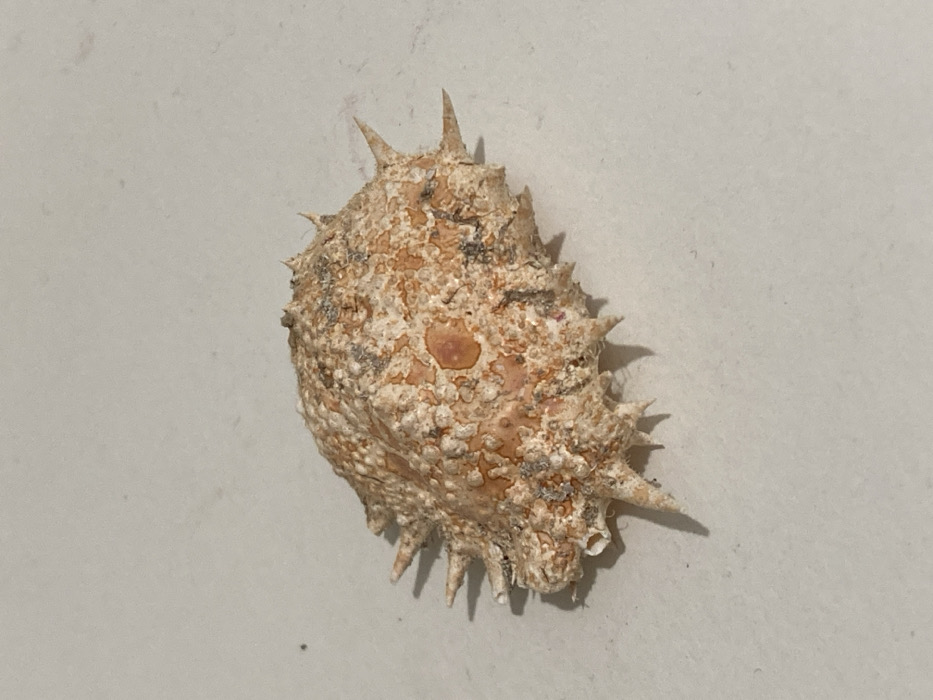 The image displays a single marine gastropod shell, likely a murex or similar species, positioned on a uniform, light grey surface. The shell is predominantly light brown and orange, heavily textured with an irregular, rough surface and numerous small, white-to-grey encrustations and darker speckles. Prominent features include multiple sharp, conical spines radiating outwards from the shell's periphery. The shell exhibits signs of natural wear, with some tips of the spines appearing blunted or broken. Lighting originates from an overhead source, casting a subtle shadow of the shell beneath it on the surface. There are no individuals, actions, or interactions depicted. The background is featureless. The image provides no visual information to determine a specific location within Palma de Mallorca, Spain, or any other geographical area.