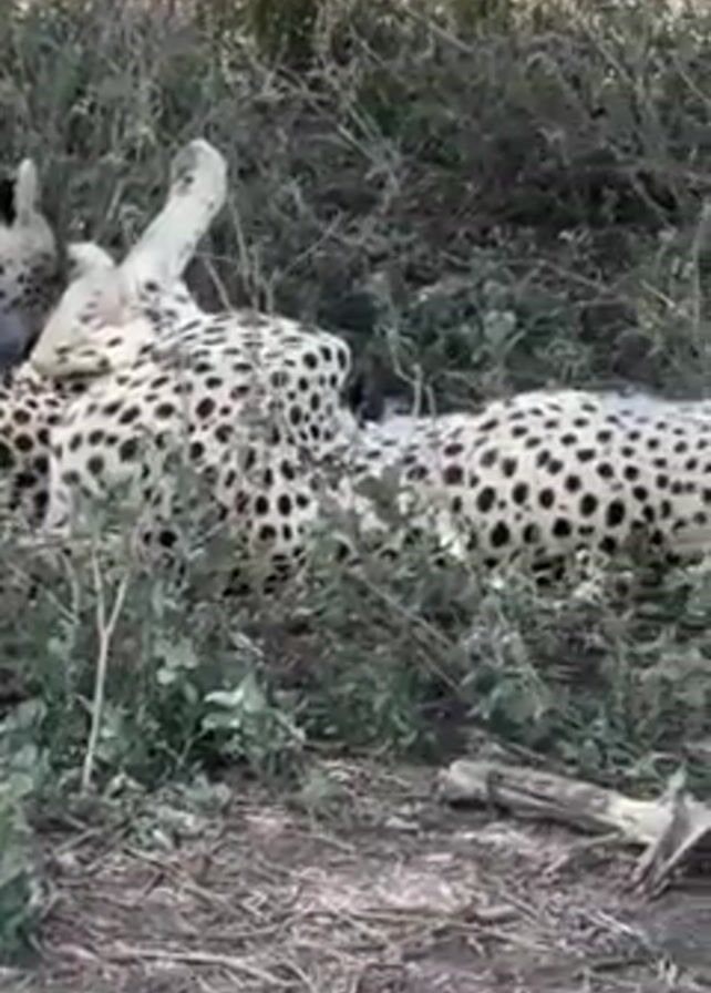 A close-up shot shows three cheetahs lying down amidst green vegetation and sparse dirt