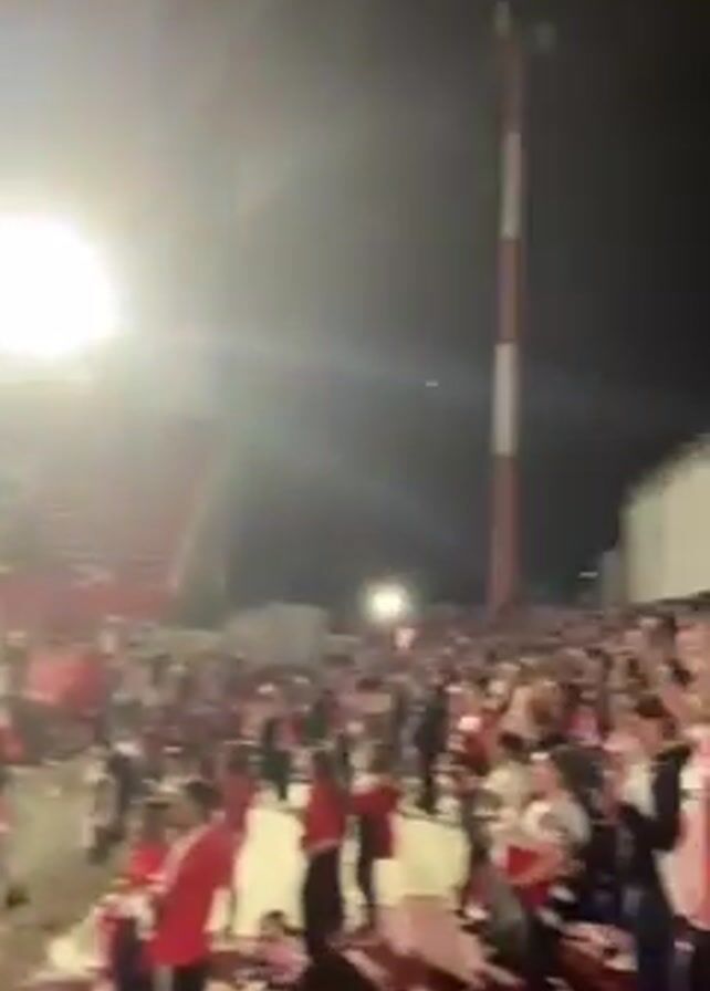 n enthusiastic crowd of soccer fans, mostly wearing red and white striped clothing, celebrating in a stadium at night. Many fans are raising their hands in the air, singing, and cheering. The stadium has a large, bright sign on the upper level that reads "Estadio Salvador Mastrosimone." Some people are standing on the field level fence. The overall atmosphere is celebratory and excited.