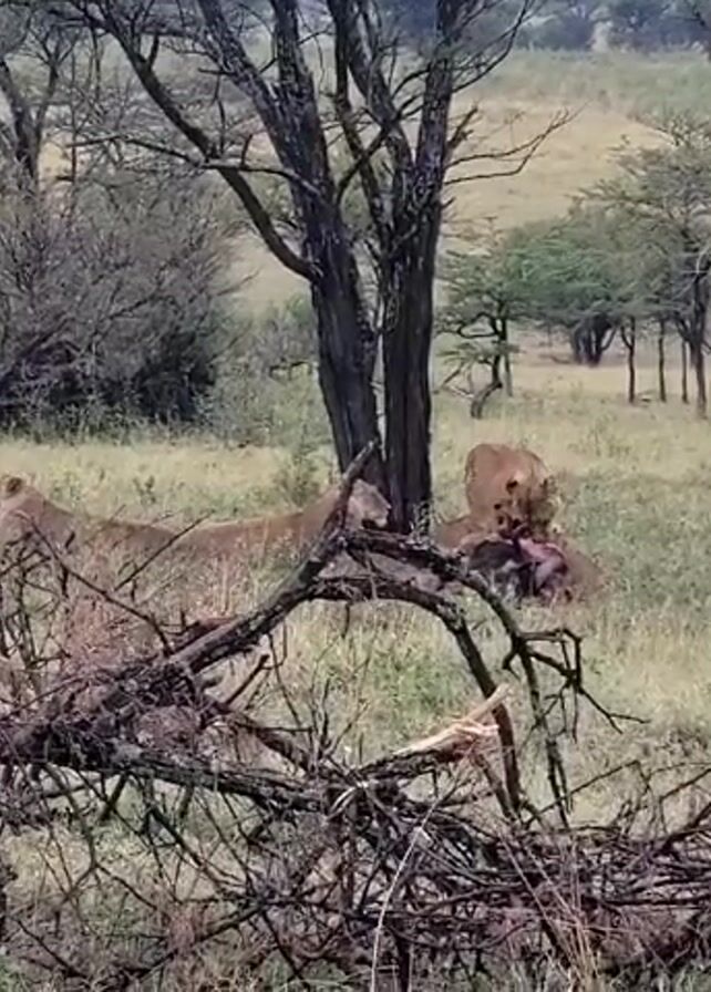 The scene shows a grassland environment with scattered trees and fallen branches. In the center, a group of four lions are gathered around what appears to be a kill. They are actively feeding on it. The overall atmosphere suggests a moment of predation in a natural setting.