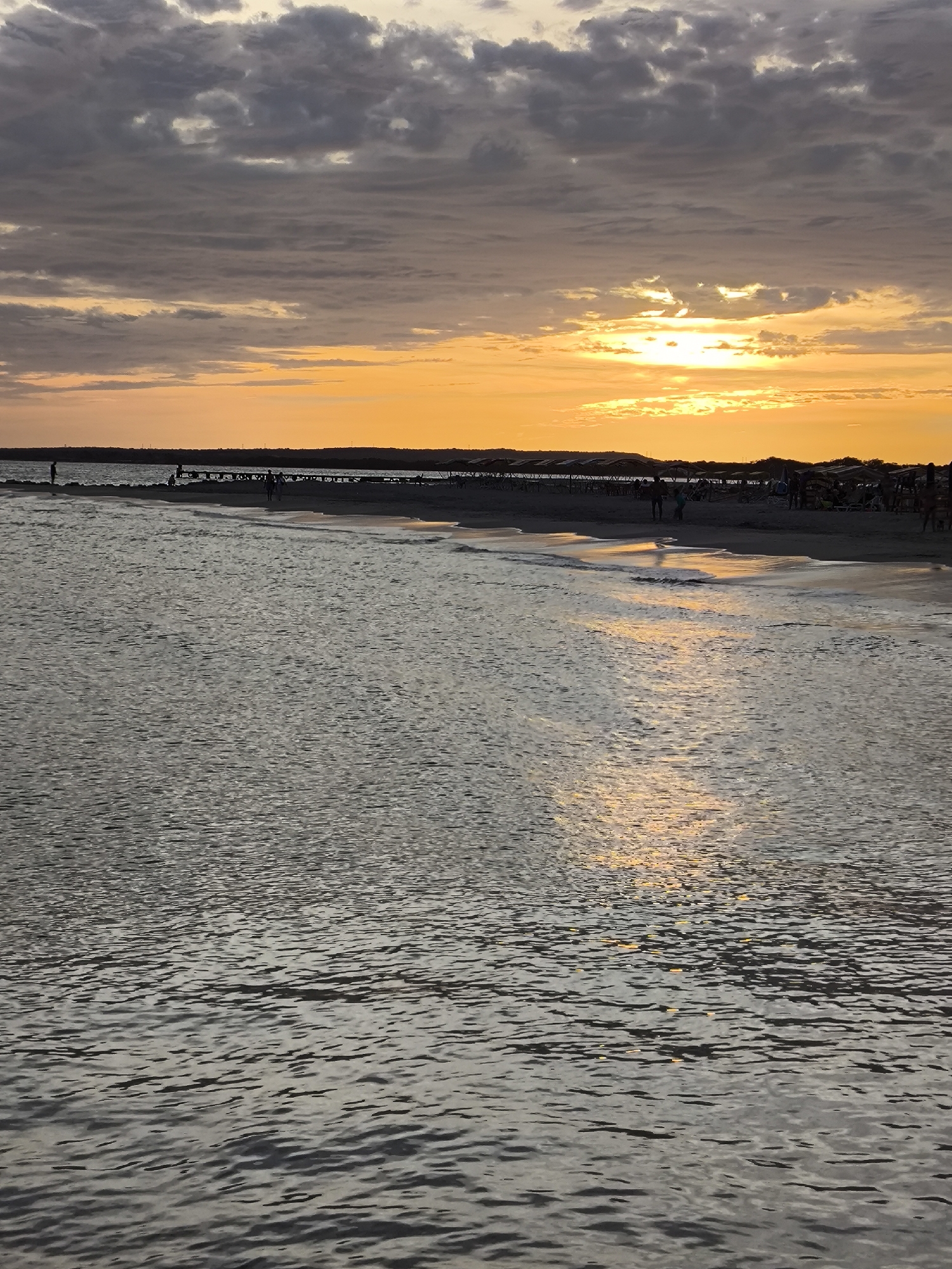 The image presents a scene from El Yaque, Venezuela, at sunset. The foreground consists of water, its surface reflecting the setting sun. In the middle ground is a beach crowded with people and sun shelters. A line of what appears to be seaweed or debris runs along the water's edge. The background features a bright orange sky with some clouds. The overall scene is one of a beach at dusk, with the light casting a warm glow over the water and sand.
