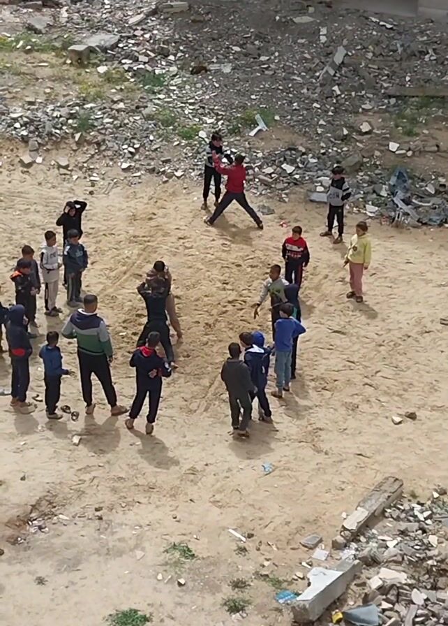 A high-angle shot shows a group of about twenty children and one adult in a sandy area, presumably playing or observing a game. The adult stands in the group on the left. In the center of the circle, two boys wrestle, while the others watch. A boy walks into the scene from the bottom left carrying a soccer ball. The environment consists of rubble, debris, and what appears to be the remnants of a building, creating a somewhat desolate atmosphere. The scene appears to have been recorded outdoors during daylight.