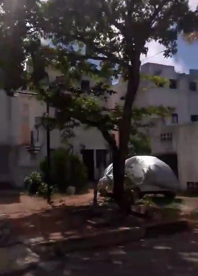 street scene with buildings, trees, and a partly cloudy sky. The buildings appear to be old and white, with multiple floors and windows. There is also a car covered by a white tarpaulin near one of the buildings. The street is paved and has some patches of dirt and grass. A lamppost stands near a corner. The camera moves, showing different angles of the scene.