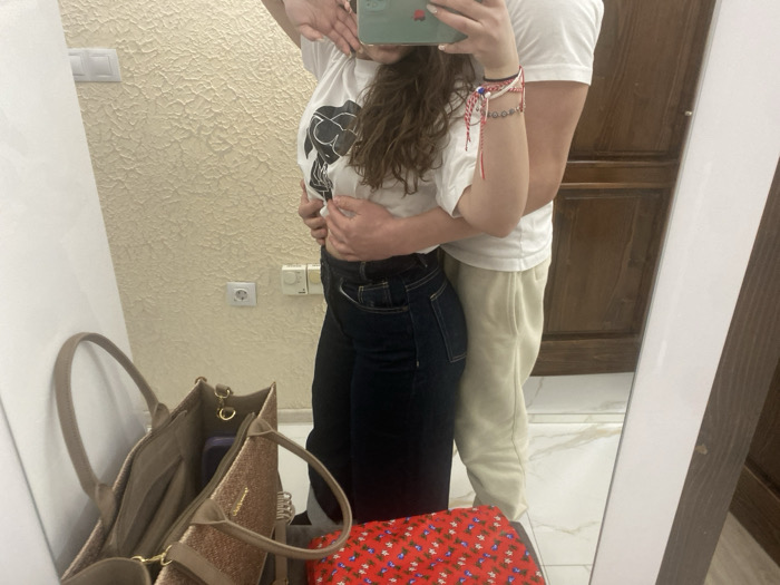 The scene is an indoor location in the city of Silistra, Bulgaria, captured as a mirror reflection. Two individuals are present. One individual, with curly brown hair, is positioned facing the mirror, wearing a white t-shirt with a dark graphic design and dark blue jeans. This individual holds a mobile phone with a light green case in their raised left hand, appearing to take a mirror selfie. Multiple bracelets, including red and white string Martenitsa, are visible on their right wrist. A second individual stands behind the first, embracing them from behind. This second individual wears a plain white t-shirt and light-colored sweatpants; their right arm is wrapped around the first person's waist, with the hand resting on the abdomen. On the floor to the left of the individuals, a light brown, textured tote bag is visible, containing a partially obscured purple object. A red fabric item with a small floral pattern lies on the floor in front of the bag. The background, reflected in the mirror, consists of a light beige textured wall. White electrical switches are mounted vertically on the wall, with a white circular electrical outlet below them. To the right of the outlet, another white rectangular control panel is visible. A dark brown wooden door with two vertical panels is reflected on the right side of the mirror. The floor is covered with light-colored, possibly white, veined tiles.