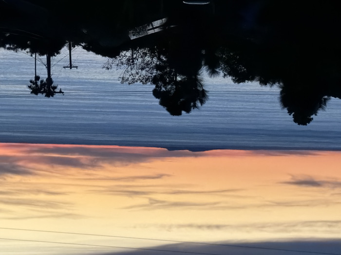 This image depicts an outdoor scene at dusk or dawn, viewed from an elevated position in Rancho Palos Verdes, United States of America, looking westward over the Pacific Ocean. The upper portion of the frame shows a sky exhibiting horizontal bands of color, transitioning from deep orange and pink hues at the horizon to lighter yellow and muted blue tones overhead, containing scattered horizontal cloud formations. Thin, dark horizontal lines, consistent with overhead power cables, are visible at the very top. The mid-ground is dominated by the expansive, blue-gray surface of the Pacific Ocean, displaying subtle horizontal patterns indicative of waves or currents. On the distant horizon, a dark, elongated landmass, identified as Santa Catalina Island, is silhouetted against the colorful sky. The foreground is heavily silhouetted, presenting a dark profile of dense vegetation and man-made structures. Coniferous trees are visible on the left and center-left. Two distinct palm trees are silhouetted on the right. A utility pole with at least two crossarms and multiple wires is present on the mid-right. A rectangular, light-colored object, possibly a skylight or solar panel, is partially visible on a structure in the lower-left-center. A small, light-toned curvature, potentially part of a vehicle roof, is visible at the bottom edge of the frame. No individuals are visible.
