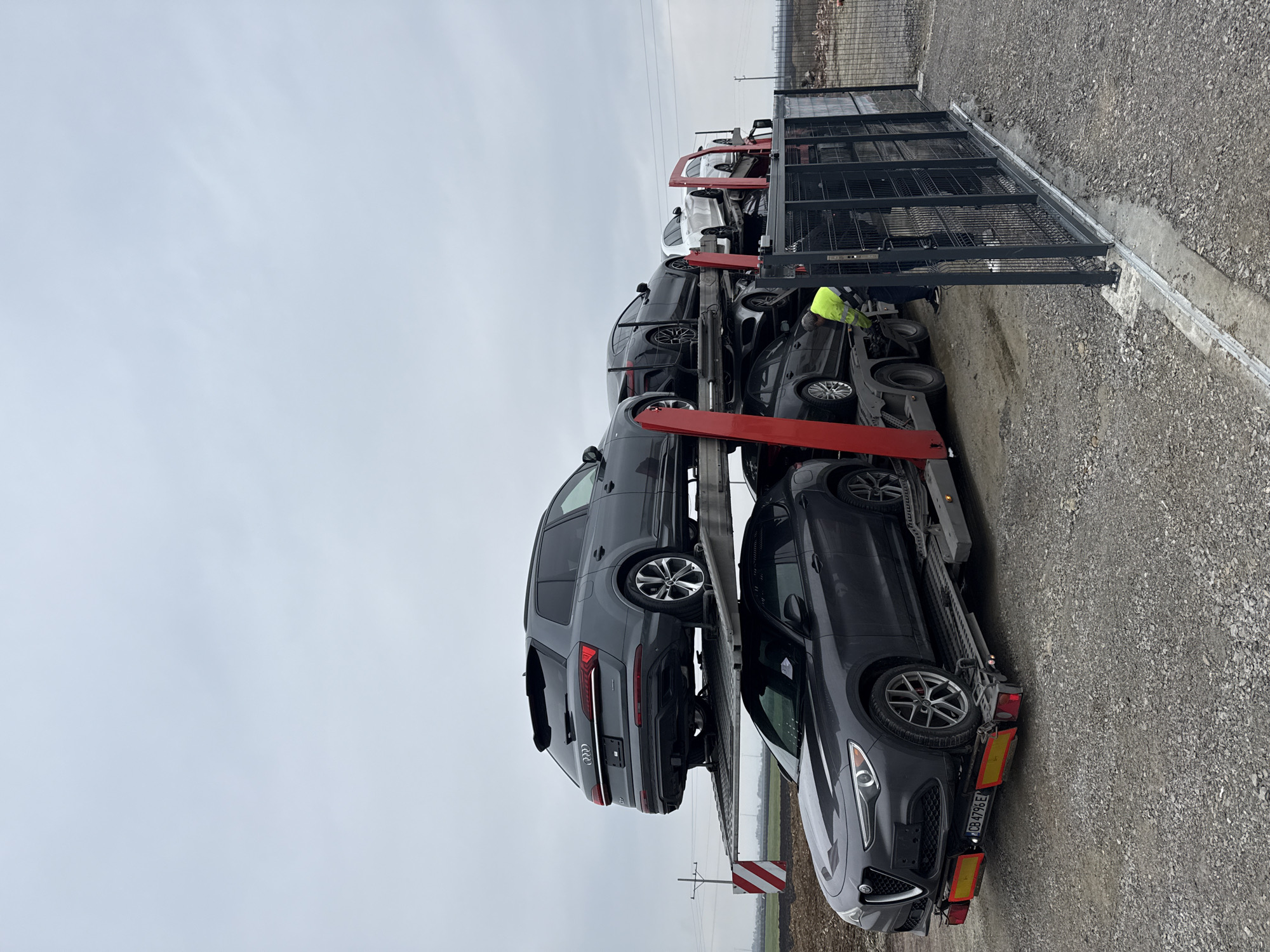 car carrier truck parked on a gravel surface, likely in Mramor, Bulgaria