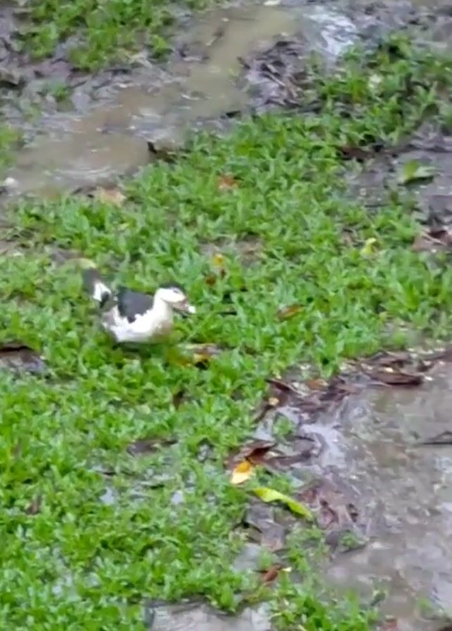 - "black and white duck standing and poking its head in a puddle of water in a muddy grassy area" by FM-ttalh2, licensed under CC BY 4.0