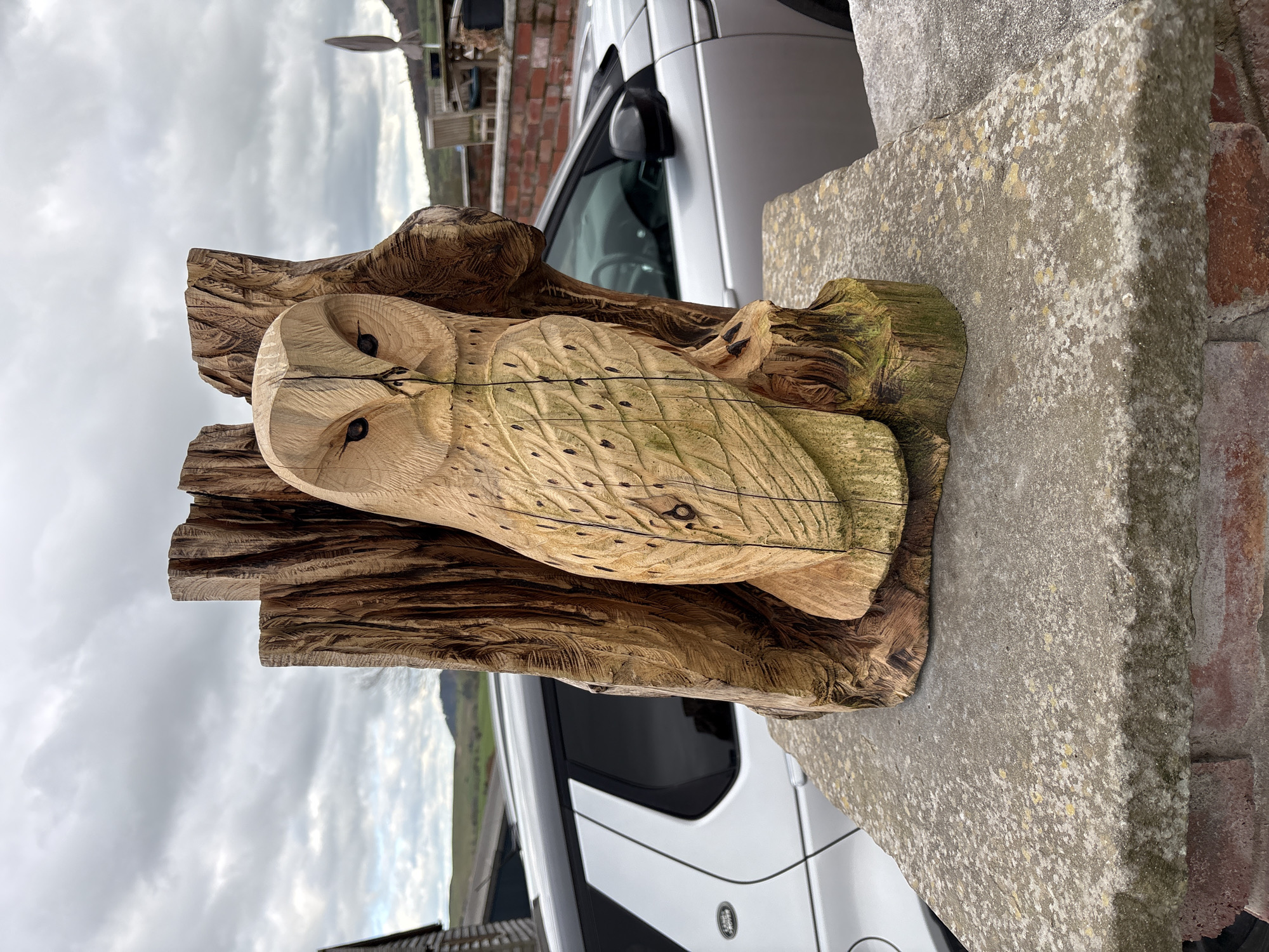 A carved wooden owl sits on a stone wall next to a white van