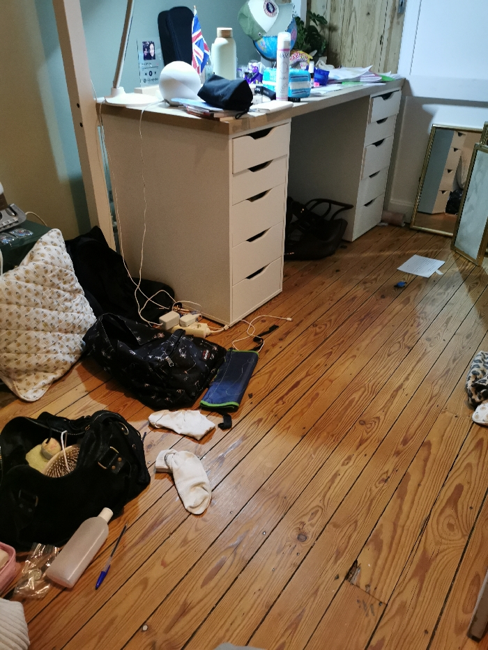 A messy room scene. A desk with two sets of white drawers holds various items. Below, the wooden floor is cluttered with bags, a cushion, socks, cords, and miscellaneous objects. There's a bottle and pen near a black handbag. A mirror stands to the right. Overall, the room appears disorganized.