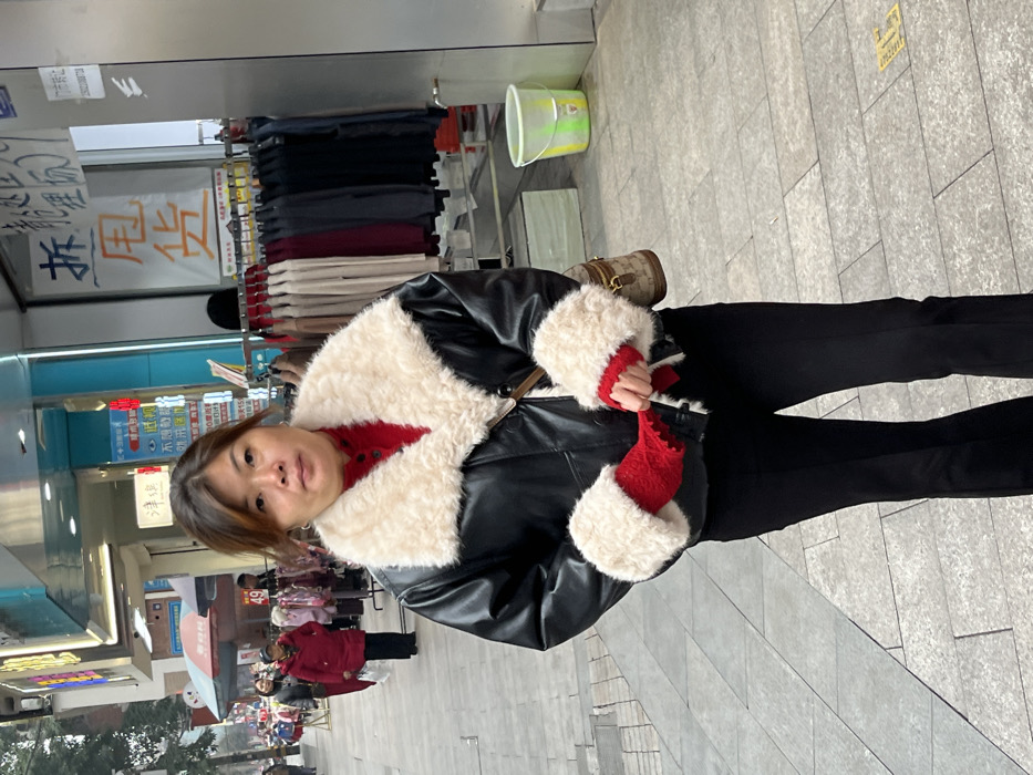 - "A woman stands in a store aisle, wearing a black leather jacket with white fur trim and red sleeves" by FM-Taoqm1, licensed under CC BY 4.0