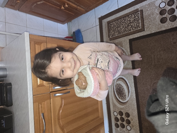 A young child stands barefoot indoors in what appears to be a kitchen or utility area in Byala Slatina, Bulgaria. The child, with dark hair, wears a light-colored, long-sleeved shirt featuring a graphic design and looks directly at the camera with a smile. She holds a soft, pink and white textile item, resembling a slipper or small blanket, which contains a small, brown, animal-like object. The background consists of light-toned wooden kitchen cabinets with silver handles, topped by a light-colored countertop on which various kitchen items are present. To the right, a darker wooden cabinet, a tiled wall, and a blue broom are visible on the floor. The child stands on a patterned area rug with circular and geometric designs in shades of brown, beige, and cream.
