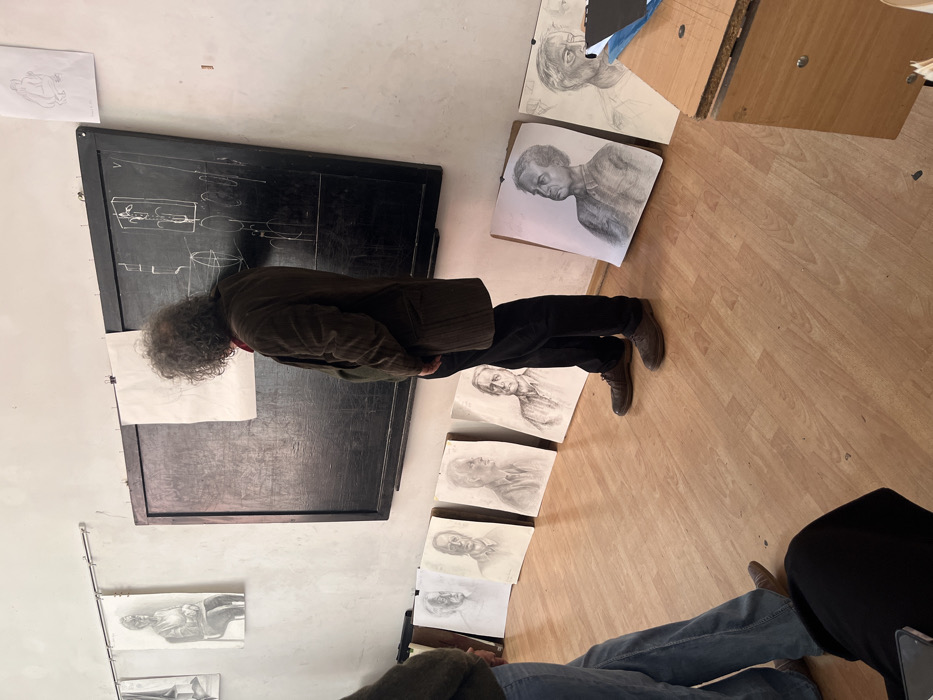 This image depicts an indoor art classroom or studio located in Sofia, Bulgaria. A male individual with curly graying hair, dressed in a dark brown corduroy jacket, dark trousers, and dark shoes, stands with his back to the viewer, facing a large, dark-framed blackboard. The blackboard displays various chalk diagrams, including geometric and anatomical sketches, and has a sheet of white paper with a pencil sketch clipped to its upper left. To the left of the blackboard, several charcoal/pencil figure drawings are suspended from a metal rod on the off-white wall. Along the base of the same wall, a row of approximately ten charcoal/pencil portrait drawings, primarily depicting male subjects, lean against the wall on a light brown laminate floor. Partial views of two other individuals are visible: one person wearing blue denim jeans stands to the left, and another, mostly obscured by a dark garment, is in the lower left foreground. A light brown wooden desk or cabinet is partially visible in the lower right corner. The room is brightly lit, suggesting an art critique or instructional setting.