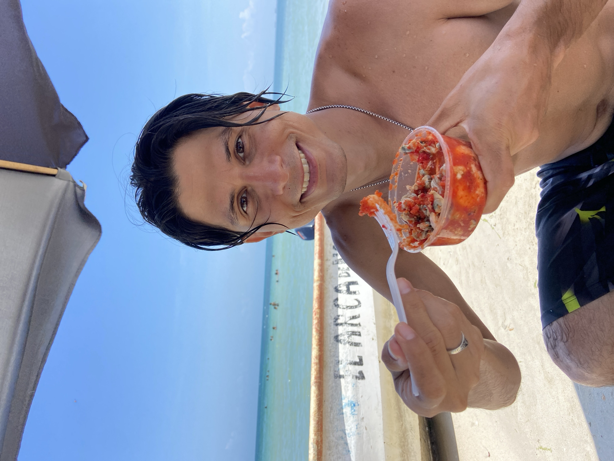 A medium shot depicts a man holding a clear plastic container filled with a red-tinged food, possibly seafood cocktail, and a white plastic fork, set against a seaside backdrop. The man, fair-skinned with dark, wet hair, smiles directly at the camera. He wears a thin metal necklace and a ring on his left hand. He is shirtless and wearing dark shorts. The scene takes place on what appears to be a concrete walkway next to a beach, visible in the background is the water, the sky, and other individuals. A beach umbrella is visible in the left of the frame. A portion of a sign reads "LL ARCA DE" is visible.