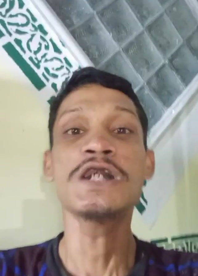 Here's a concise description of the video: A man with dark hair, a mustache, and a slight goatee is centered in the frame. He is wearing a dark shirt with blue and red patterns. The camera appears to be hand-held, possibly a selfie perspective. The man opens his mouth wide, as if yawning or making a surprised expression. Behind him, the background consists of a light yellow wall and a window composed of glass blocks in a white frame. The wall also has a green decorative trim. The video appears to be filmed indoors.