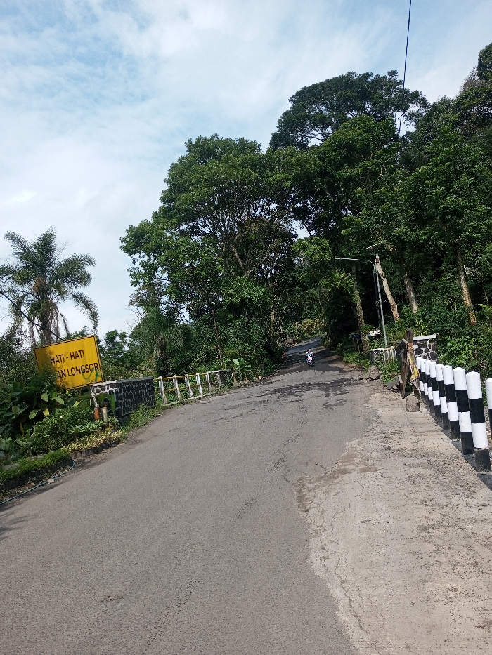 A paved asphalt road, displaying minor surface cracking and wear, ascends and curves to the right through a densely vegetated mountainous or rural area in Sandamal Eliya, Sri Lanka. The sky above is partly cloudy. On the left side of the road, a prominent rectangular yellow sign with black text reads "HATI-HATI RAWAN LONGSORI," partially obscured by a variety of green plants and a tall palm tree. A low stone wall with white metal railings lines the left edge of the road. On the right side, a concrete shoulder exhibits significant surface cracking and is bordered by a series of alternating black and white cylindrical bollards. Further along the right, a utility pole with an attached street light is visible, surrounded by tall, dense green trees forming a substantial canopy. A small white motorcycle is observed in the middle distance, moving uphill on the road, traveling away from the viewer. No pedestrians or other vehicles are distinctly visible.