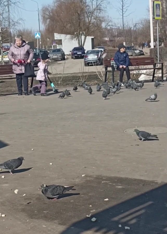 sunny day in a public square. A small girl wearing a pink jacket and dark pants is walking amongst a large group of pigeons feeding on pieces of bread scattered on the pavement. An older woman in a pink patterned jacket stands nearby watching the girl. A second woman, dressed in a blue jacket and dark pants, sits on a bench observing. A stroller stands beside the bench. Cars are parked along the street in the background. Trees are visible, some bare and others with budding leaves. The ground is mostly concrete with some damp patches. The shadow of the person filming stretches across the foreground.