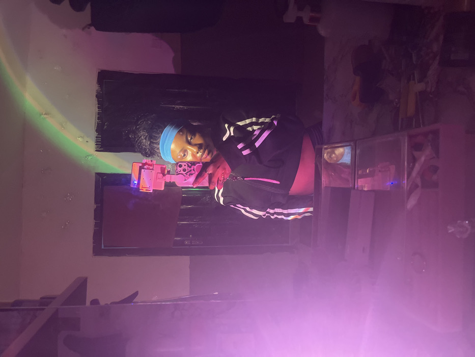 A young woman with a blue headband poses for a selfie, holding a pink phone. She wears a black jacket with pink and white stripes. The background includes a black window covering and a shelf or cabinet with reflective doors. A green and rainbow light shines on the wall. The bottom half of the image is obscured by a strong pink light.