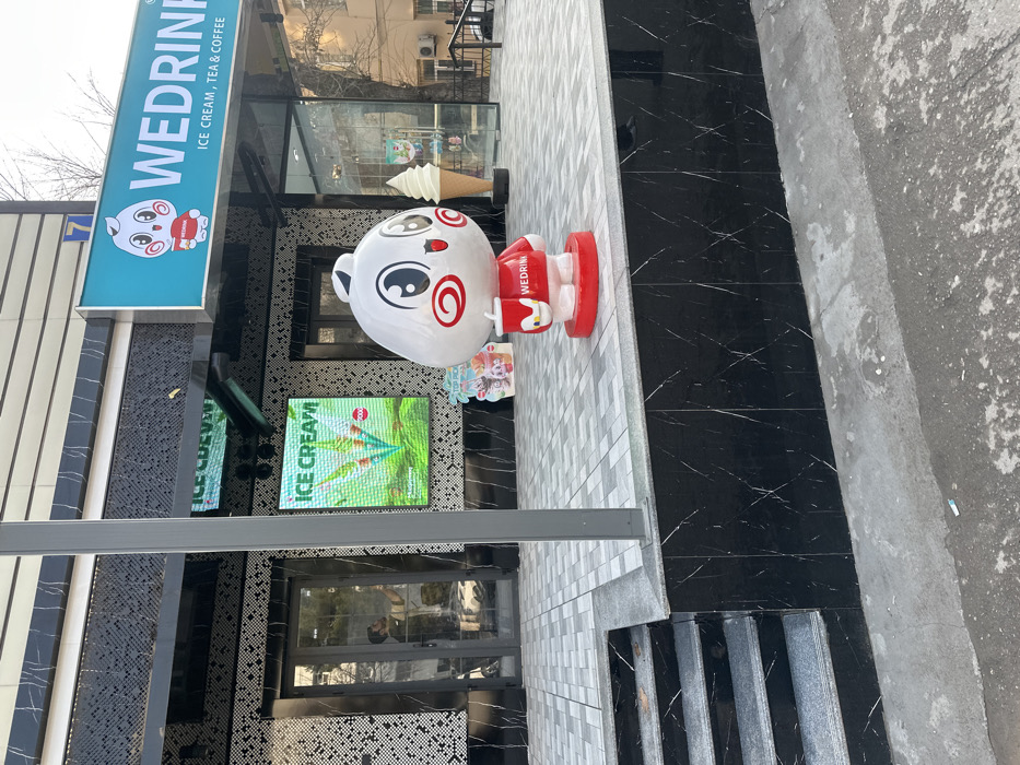 This image depicts the exterior of a commercial establishment named "WEDRINK ICE CREAM, TEA & COFFEE" on a street in Tashkent, Uzbekistan. The building's facade features a lower section clad in polished black marble tiles with distinct white veining, topped by a textured dark grey and white mosaic-patterned section. Above the entrance, a prominent turquoise sign displays "WEDRINK ICE CREAM, TEA & COFFEE" alongside a white cartoon mascot holding a red cup. A small blue plaque with the number "7" is affixed above the sign. The entrance consists of double glass doors. To the left of these doors, a large vertical LED screen displays an advertisement for "ICE CREAM" with a vibrant green background. To the right of the doors, a tall, white replica of an ice cream cone stands on the patio. In the immediate foreground, directly in front of the establishment, a large, white and red stylized cartoon mascot, matching the WEDRINK branding, stands on a red circular base on the elevated patio. This mascot has large black eyes, red spiral cheeks, and holds a red cup with "WEDRINK" printed on it. The patio is paved with grey interlocking tiles. It is accessed from the street level by a set of four black marble steps located on the left side of the frame. The street-level pavement is concrete and appears worn. A slender grey pole is positioned centrally in front of the steps. A single male individual, wearing a dark shirt and shorts, is visible in the reflection of the left glass door, appearing to face inwards towards the building's interior. In the background, beyond the building, bare tree branches are visible against a light sky, and parts of another light-colored building are discernible.
