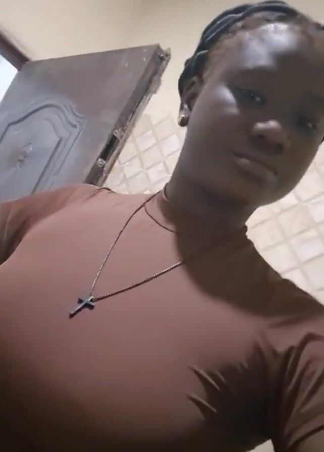 A young Black woman stands indoors, facing the camera. She has braided hair, and wears a brown, short-sleeved top and a necklace with a cross pendant. She sticks out her tongue and makes a peace sign with her fingers. Behind her is a closed brown door and beige tiled wall. The video is shot from a low angle.