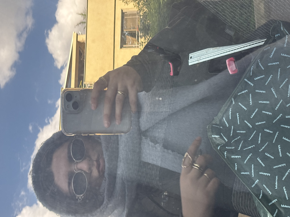 An individual is depicted taking a selfie reflected in a window, likely a vehicle's. The person, with dark hair, wears oval-shaped sunglasses with decorative frames, a thick grey knitted scarf wrapped around their head and neck, and a dark long-sleeved garment. Their lips are slightly pursed. They hold an iPhone, likely a Pro model with a clear case, in their right hand. The left hand, adorned with multiple gold-toned rings, is visible, with the index finger pointing downwards. Inside the reflection, within the vehicle's interior, a dark green Lululemon shopping bag with repeating white logos is visible in the lower left. To its right, two pink/red seatbelt buckles and a silver-colored reflective strip are present on a dark surface. The background, reflected through the window, shows an outdoor scene under a blue sky with scattered white clouds. A multi-story, light yellow or ochre-colored building with multiple windows and flat rooflines is prominent. Green foliage from trees or bushes is visible near the building's base. The scene is located in Ramat HaSharon, Israel.