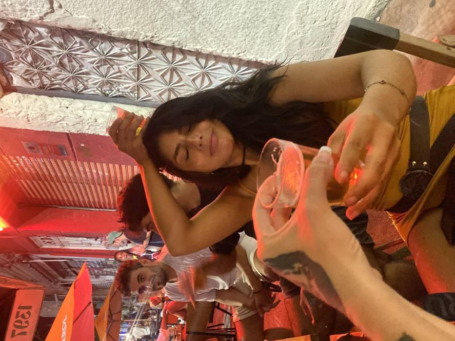 A crowded scene shows a woman with long dark hair, eyes closed, wearing a yellow top and black belt, holding a drink. Another person's hand, tattooed and holding a drink, is prominent in the foreground. Several people are visible behind them, including a man with a beard wearing a white shirt. The background features outdoor bar decorations, a decorative patterned ceiling, and red lighting. The image is rotated, creating a tilted perspective.