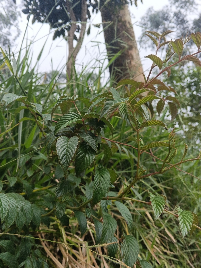 The image displays a dense natural environment in Khna, Cambodia. In the foreground, a prominent leafy plant, possibly a shrub or vine, features numerous serrated, ovate leaves primarily dark green, with newer growth exhibiting lighter green foliage and reddish-brown stems. The midground is filled with dense, upright green grass interspersed with dry, light brown grass stalks. In the soft-focus background, the bark of two tree trunks is partially visible against a light gray, overcast sky. No individuals or specific activities are present within the frame.
