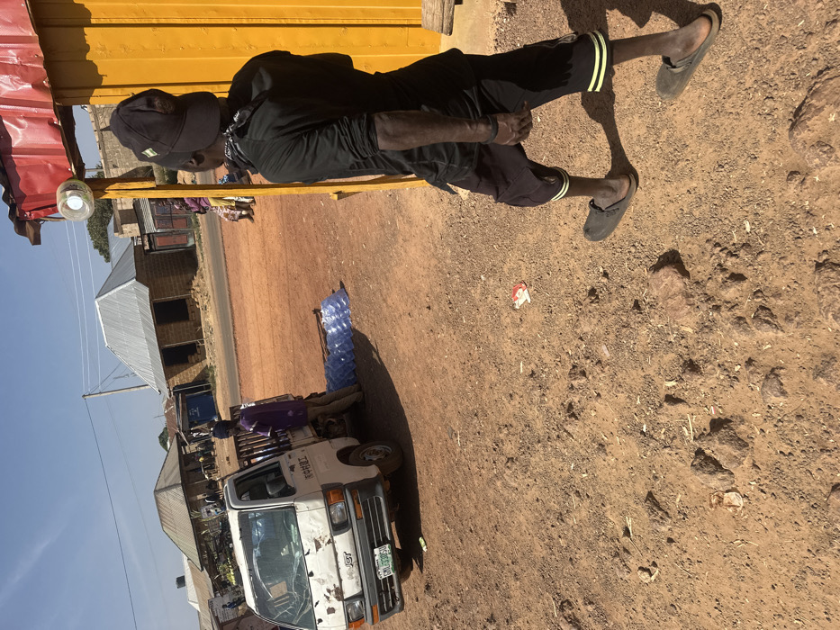 The scene depicts a sunny, outdoor environment in Durimi, Nigeria, characterized by dry, reddish-brown soil with scattered rocks and minimal litter. In the foreground, a male figure with dark skin walks right to left, away from the viewer, while looking back over his right shoulder towards the midground. He wears a black long-sleeved shirt, a black bandana around his neck, a black baseball cap, black cargo shorts with yellow stripes on the cuffs, and black slide sandals. His right arm is slightly bent, and his left arm swings naturally. He is passing a bright yellow corrugated metal kiosk with a red corrugated metal roof, from which a transparent plastic bottle is suspended. In the midground, to the left of the kiosk, a white "HI-JET" pickup truck with Nigerian license plate "GBK-330 SG" is parked on the unpaved ground. The truck's front bumper shows damage and discoloration, and the windshield appears dirty or cracked. Two individuals are interacting near the truck bed. One, wearing a purple shirt and khaki trousers, is bent over near the vehicle, seemingly handling items. Next to the truck, on the ground, are multiple stacks of transparent blue plastic bottled water containers. The background features a paved road running horizontally, beyond which are various single-story buildings. These structures exhibit different finishes, including unfinished brick, painted facades, and multiple corrugated metal roofs. Wooden utility poles with wires are visible against a clear, bright blue sky. Several indistinct figures are present in the distant background near the road and buildings.
