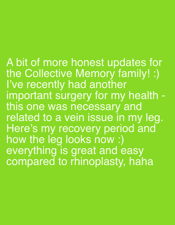 The image displays white text on a uniform, bright lime green background. The text, rendered in a sans-serif typeface, occupies the central portion of the frame. It reads: "A bit of more honest updates for the Collective Memory family! :) I've recently had another important surgery for my health - this one was necessary and related to a vein issue in my leg. Here's my recovery period and how the leg looks now :) everything is great and easy compared to rhinoplasty, haha". No discernible people, subjects, objects, actions, interactions, or specific environmental features are visually present. The image does not contain any visual information to determine a location, including within the city of Kyiv, Ukraine.