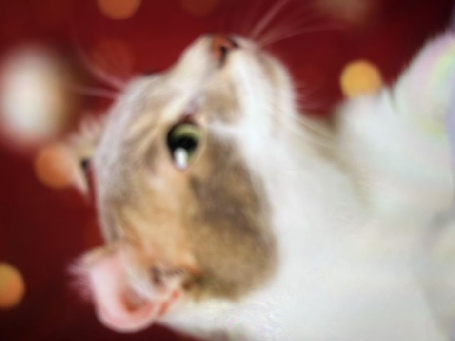 An out-of-focus, close-up captures a cat's face from a low angle. The cat has white and brown fur, with a glimpse of its pink tongue and a vibrant green eye. The background is blurred, featuring a red hue interspersed with warm, out-of-focus golden orbs. The cat seems to be looking upwards, creating an intriguing and dreamy perspective.